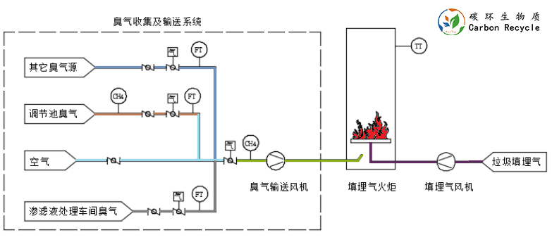 公司在武漢某垃圾填埋場對原有填埋氣火炬改造,目的是利用新火炬系統(tǒng)在燃燒填埋氣時燃燒產(chǎn)生的熱量,對于填埋場滲濾液處理設施產(chǎn)生的臭氣進行熱氧化除臭。垃圾滲濾液調(diào)節(jié)池及垃圾滲濾液處理車間產(chǎn)生的臭氣集中收集后用管道通過風機輸送至火炬配風口混入火炬焚燒。在臭氣管道上設置氣體濃度分析儀、緊急切斷閥等安全保護裝置,保護裝置與輸送風機、火炬連鎖控制。